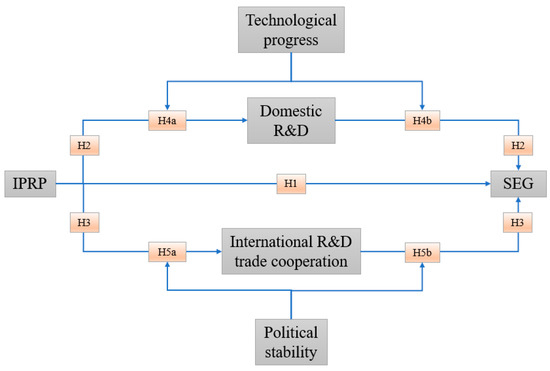 Secondly, consider the impact of IPRP on IR&DTC. Intellectual property rights are inherently international and align closely with the dynamics of the global economy [39]. Studies have shown that countries with weak IPRP pose significant risks to local enterprises’ R&D and innovation activities due to the high likelihood of knowledge spillover. Consequently, R&D and innovation-oriented companies in these regions often relocate to countries with stronger IPRP, impeding multinational enterprises’ R&D investment and IR&DTC [40]. Conversely, strong IPRP provides the necessary institutional guarantees for R&D cooperation and technology transfer. Research indicates that countries with robust IPRP attract foreign investment and promote trade cooperation [41]. A recent study found that strengthening IPRP in developing countries positively affects the availability of low-carbon technologies from developed countries [42]. In essence, enhancing IPRP in developing countries fosters international technology transfer and R&D cooperation [43]. Thus, IPRP not only boosts DR&DL but also promotes IR&DTC, ultimately contributing to sustainable economic growth (SEG). Based on this, we propose Hypotheses 2 and 3.