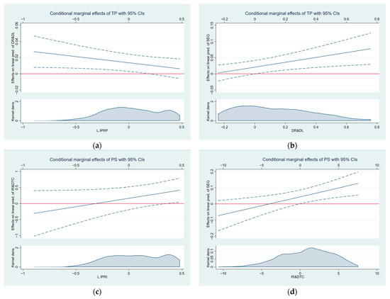 (a) Marginal Effect of IPRP on DR&DL with increasing TP. (b) Marginal effect of DR&DL on SEG with increasing TP. (c) Marginal effect of IPRP on IR&DTC with increasing PS. (d); Marginal effect of IR&DTC on SEG with increasing PS.