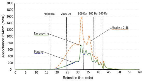 To determine the efficiency of the enzymes, the DH and peptide molecular weight of the hydrolysate produced were evaluated. With an enzyme concentration of 0.8 U · L−1, a pH of 6.8 and 2 h of reaction time, a DH of 19 ± 1% was obtained with Alcalase 2.4L, while with Papain, the biomass was almost not hydrolyzed (DH 0.2 ± 1%). This was confirmed by the SEC-HPLC results. Figure 1 shows the chromatographic profiles of the Alcalase 2.4L and Papain hydrolysates and the control. No increase in peptide concentration was observed with the addition of Papain, as its chromatogram profile is identical to that of the control without enzymes. There is evidence that Papain can successfully extract the oil from Schizochytrium spp. lipid droplets after cell disintegration by ultrasound [30] and that it can also hydrolyze Aurantiochytrium limacinum protein residue after oil extraction [18]. However, it seems that without pre-treatment of the biomass, this enzyme does not work as well as Alcalase 2.4L. Although Alcalase 2.4L is an enzyme whose optimum is in the pH range of 7 to 8, this study demonstrates that even at a low pH, this enzyme is more efficient than other enzymes whose pH optimum is more acidic. However, even if the DH obtained with Alcalase 2.4L is within the values targeted by this study, it is important to optimize the hydrolysis conditions in order to maximize the results with a minimal enzyme concentration (3% of the protein content in this experiment) due to economic (since this is the most expensive factor in this kind of process) and sustainability issues.