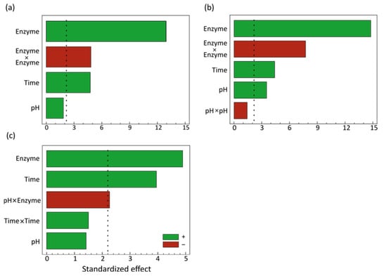 Pareto charts showing the effect of the different factors (enzyme-to-substrate ratio (Enzyme), time and pH of hydrolysis) and the interactions and quadratic effects on (a) degree of hydrolysis (DH), (b) peptide (PEP) concentration and (c) total lipid DHA (TL-DHA) of thraustochytrid hydrolysate. The vertical-dashed lines represent the significance level (p = 0.05). The green bars show a positive effect, while the red bars show a negative effect.
