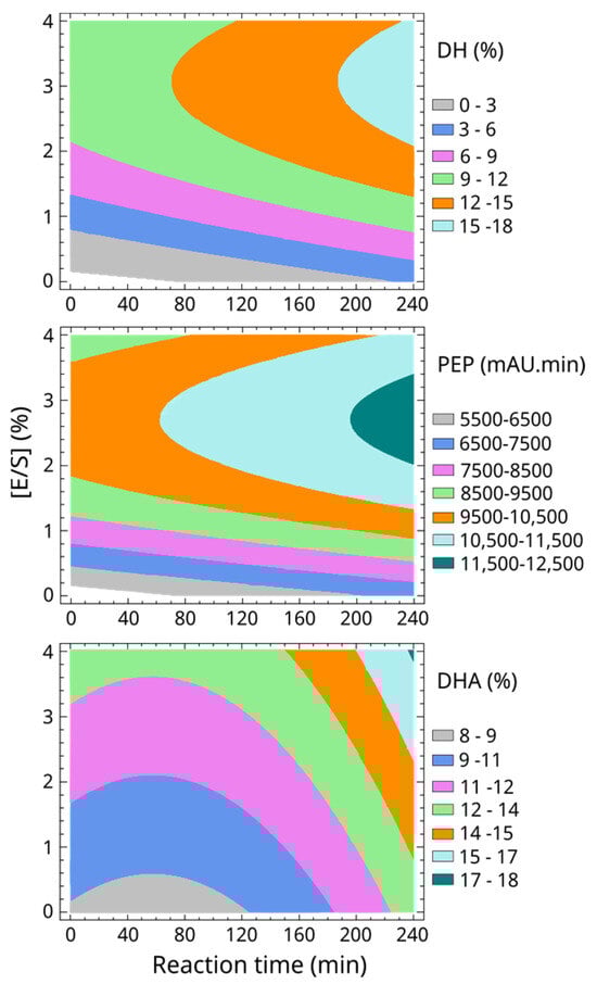 Estimated response surface contours showing the effect of the interaction between two independent variables (enzyme-to-substrate (E/S) ratio and hydrolysis reaction time) on the degree of hydrolysis (DH), peptide (PEP) concentration and total lipid DHA (TL-DHA) of thraustochytrid hydrolysate when the third variable is kept at the intermediate level. In this case, the pH was kept at 7.5.