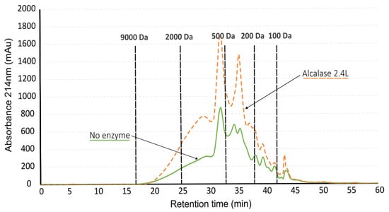 The validation was performed using a pH of 7.5, a reaction time of 205 min and an E/S of 2.7%. With these conditions, the predicted values were 15.3% for the DH, 11,573 mAU · min for the PEP concentration and 14.1% for the TL-DHA concentration in the AP. The chromatogram obtained using SEC-HPLC (Figure 4) reveals a significant production of peptides due to the addition of Alcalase 2.4L. The analysis of the area of each peptide fraction (Table 6) demonstrated a significant increase in the molecular weight fractions between 2000 and 200 Da in the Alcalase 2.4L-treated samples, which is the fraction that was targeted for maximization in the RSM.