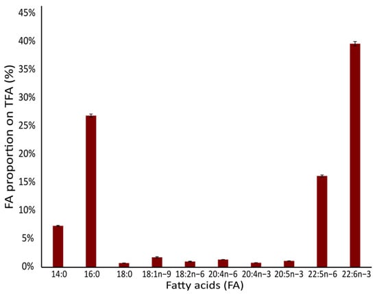 The commercial value of thraustochytrid biomass lies in its lipid content and composition. Those parameters were studied in depth for the hydrolyzed biomass to see whether the process could have a negative impact on its PUFA content and profile. In the WH, the lipid content was conserved after hydrolysis (40.0 ± 2.4% of DW), and the FA profile was not affected by the hydrolysis conditions used as compared with the biomass before hydrolysis (Table 3). The major FAs were DHA and 16:0, and their contents were not modified by hydrolysis (Figure 5). In the AP, the total lipid content was 14 ± 0.3% of DW.