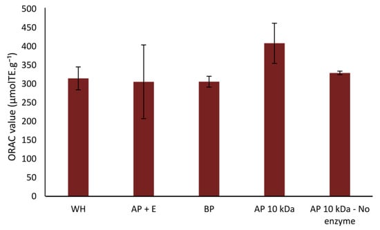 Antioxidant activity (ORAC) of the whole hydrolysate (WH) and its different fractions: aqueous phase + emulsion (AP + E); bottom phase (BP); aqueous phase filtered at 10 kDa (AP 10 kDa). The values of the aqueous phase filtered at 10 kDa of the control are also represented (AP 10 kDa—no enzymes). Mean ± S.D.