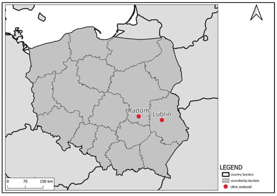 Radom is a city with borough status. It is located in Mazowieckie Voivodeship approximately 100 km south of Warsaw and 100 km west of Lublin. It covers an area of 112 km2, and its population was 197,848 people in 2022 [39]. While the city of Radom serves many functions, similarly to Lublin, it is Warsaw, the voivodeship and national capital, that fulfils most of the central administration functions. According to the physical–geographic regionalisation by Solon et al. [40], the city is located within the South Mazovian Hills macroregion, the Radom Plain mesoregion, and (in a small part) the Kozienice Plain. Mleczna (tributary of Radomka) is the largest river flowing through Radom. In the 1970s, a water retention reservoir was built in Radom’s Borki district; it also serves for recreation and leisure. The city has a high percentage of tall greenery areas (57.5%) and a high percentage of people (64.5%) living within walking distance (less than a 5 min walk) from these areas [41].