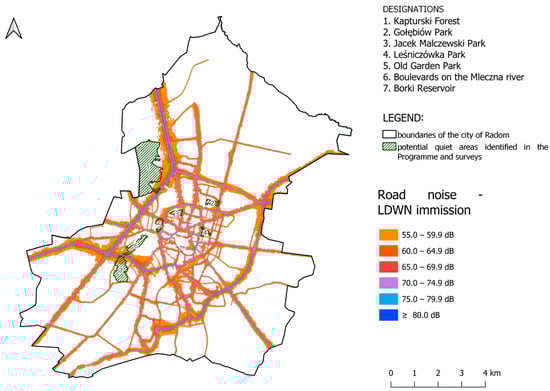 The first step in the delimitation of quiet areas was analysing the acoustic map and looking for “blank spots”, i.e., areas not exposed to any type of noise. An acoustic analysis taking into account the LDWN indicator for road noise emissions was carried out based on the publicly available noise map for Radom and noise map for Lublin. In Poland, the Ordinance of the Minister of Environment of 14 June 2007 on permissible noise levels (as amended) specifies the boundary values of LAeq noise at 50–68 dB (daytime) and 45–60 dB (nighttime) for traffic noise, 45–55 dB (daytime) and 40–45 dB (night) for other sources of noise (except for aviation), and LDWN at 50–70 dBA and LN at 45–65 dBA (traffic noise), LDEN at 45–55 dBA and LN at 40–45 dBA (other sources of noise except for aviation), depending on the type of land. Based on this document and the acoustic criteria defining the ways of identifying quiet areas in an agglomeration [17] and WHO recommendations [45], it is accepted that LDWN should not exceed 55 dB for potential quiet areas. In addition, no area exposed to aviation noise may be recognised as a quiet area.