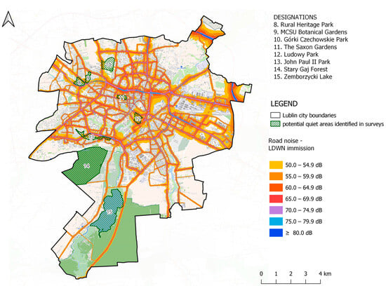 Figure 4 shows noise pollution from major roads in Lublin and the potential quiet areas identified in the survey, numbered 8 to 15. An analysis of the acoustic map has shown that some potential quiet areas are partially, or fully, exposed to noise. The area of the Rural Heritage Park (no. 8) and MCSU Botanical Gardens (no. 9) are exposed to a small extent to motor traffic noise from Solidarności Ave and Warszawska Ave; in the case of the latter, it is also the noise from Sławinkowska St (from the west) and Willowa St (from the north). However, the central parts of the Rural Heritage Park and MCSU Botanical Gardens are not exposed to noise. In the case of the Górki Czechowskie Park (no. 10), only the western part of the area is slightly exposed to noise from Bohaterów Września St. The Saxon Gardens (no. 11) is exposed to noise from Racławickie Ave. Nearly all of the park’s area is within the upper threshold of noise for quiet areas (55 dB). The People’s Park (no. 12) is situated between Lubelskiego Lipca ′80 St, Józefa Piłsudskiego Ave, and Stadionowa St. These streets generate considerable noise levels. Only the central part of the park is exposed to noise levels of 50–55 dB. The eastern and central parts of John Paul II Park (no. 13) are exposed to considerable noise levels from John Paul II Ave. The other parts of the park are outside zones exposed to noise.