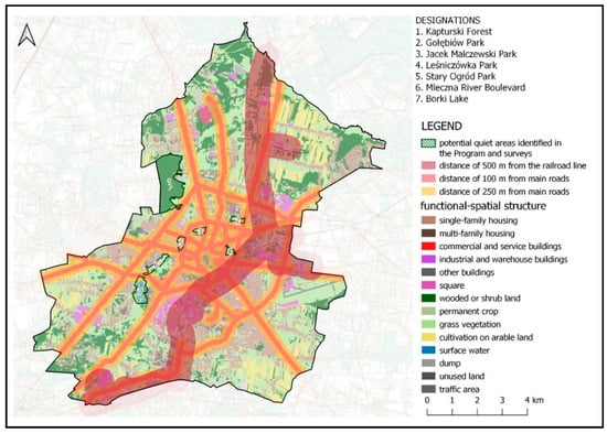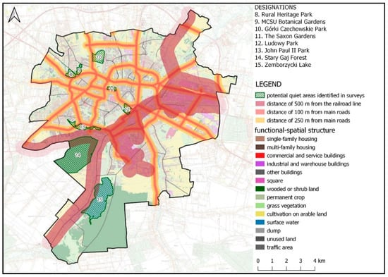 Potential quiet areas in Lublin against the background of functional–spatial structure and distance from main roads and railways.