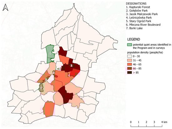 Potential quiet areas in Lublin on the population density map for the districts of Lublin.