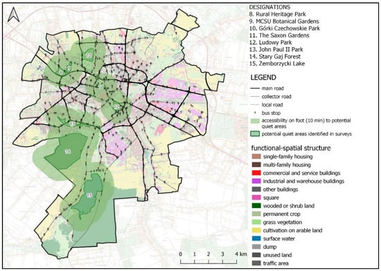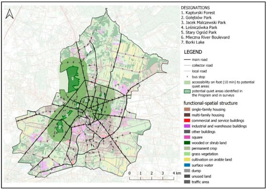 The functional and spatial structure of Radom is presented in Figure 5. The central part of the city consists primarily of multi-family housing and service areas, as well as a considerable number of public spaces. Green areas cover a small portion of the centre, but much greater concentrations of these areas occur in the northern and southern park of the city. Industrial buildings are located in the centre, along the main roads (e.g., the Łucznik Zone—premises of the former Łucznik Metal Works). Single-family housing is located primarily on the outskirts. The potential quiet areas identified both in the Environmental Protection Programme Against Noise and in the survey are mostly forest areas, public green areas, and surface water areas (Borki Lake) with recreational functions [44]. All the quiet areas proposed meet the land cover criteria.