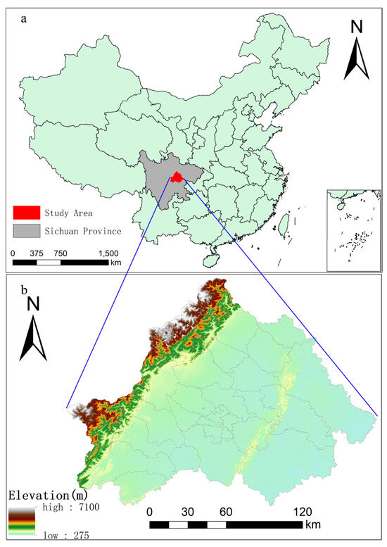 The location of the research area. (a) The location of the study area in China; (b) Elevation of the study area.