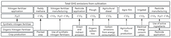 Previous studies did not comprehensively incorporate all relevant emission sources when measuring GHG emissions from cultivation. Initially, studies predominantly focused on GHG emissions from agricultural materials. Subsequent research incorporated rice cultivation as an emission source; however, it overlooked the potential influence of varying moisture conditions on GHG emission coefficients during and before the rice cultivation period. Furthermore, while N fertilizer application has been recognized as a significant emission source, prior studies have primarily treated N fertilizer application as a collective entity and have not sufficiently considered emission factors specific to different crop species. Consequently, the current study has improved on the previous studies. Firstly, we have incorporated secondary emission sources, such as nitrogen fertilizer production, agricultural films, and pesticide manufacturing, into the emission calculation framework. Secondly, we meticulously differentiated between various emission factors attributable to differing moisture conditions during rice planting and pre-planting periods. Additionally, we have applied distinct emission factors for nitrogen fertilizer application. Variations in emission factors for nitrogen fertilizer application across different crop types necessitate a more nuanced approach to evaluating the impact of nitrogen fertilizer application on GHG emissions. By leveraging experimental data from other researchers, we identified precise emission factors for nitrogen fertilizer application across various crop species, enabling us to more accurately quantify the contribution of nitrogen fertilizer application to GHG emissions. This study not only comprehensively considers traditional emission sources but also meticulously examines emission sources that may have been neglected in previous studies. By considering various factors, our objective is to offer a more precise methodology for assessing GHG emissions from cultivation. Moving forward, we will explore additional potentially overlooked emission sources and refine our assessment methodology.
