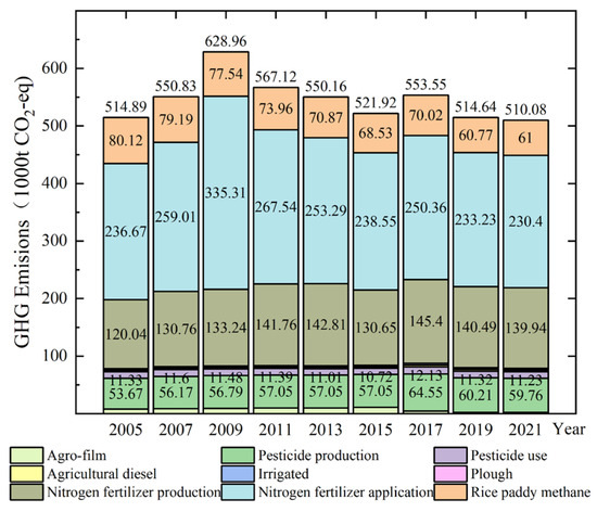 Figure 4 shows that over the last 16 years, the proportions of emissions from GHG-emitting sources have been, in descending order, as follows: Nitrogen fertilizer Application (with an average annual emission of 2,560,410 t) > Nitrogen fertilizer Manufacturing (1,361,224 t) > Methane Emission from Rice Paddies (713,335 t) > Pesticide Manufacturing (580,324 t) > Pesticide Application (113,584 t) > Agricultural Films (72,880 t) > Agricultural diesel (27,073 t) > Irrigation (26,257 t) > Ploughing (2908 t); the specific numerical values are detailed in Table 2. Nitrogen fertilizer application was the most dominant source of emissions, accounting for 46.77% of the total average annual emissions, followed by nitrogen fertilizer production with 25.02%, a finding consistent with that of other studies. An assessment by Cheng et al. [43] showed that 57–53% of the carbon footprint of crop production in China comes from nitrogen fertilizer use. Similarly, Hillier et al. [44], in their study in the UK, found that nitrogen fertilizers accounted for 75% of total emissions from crop production. Greenhouse gas emissions due to nitrogen fertilizer application and fertilizer production have generally experienced a change from an increase to a fluctuating decrease. It is evident that the efficient use of resources such as nitrogen fertilizer and the mitigation of its environmental impact are critical issues for the reduction of greenhouse gas emissions from the cultivation industry and the development of sustainable agriculture, and the reduction of nitrogen fertilizer application and the improvement of nitrogen fertilizer utilization are the key ways to reduce greenhouse gas emissions from the cultivation industry. The share of methane emissions from rice paddies in total greenhouse gas (GHG) emissions has declined from 15.36% in 2005 to 11.96% in 2021, primarily owing to an 83,900 ha reduction in the area of rice paddies, from 352,900 hectares to 269,900 ha. Greenhouse gas emissions from pesticide manufacturing, which accounted for 10.68% of total annual emissions, are closely related to the area under cultivation and have shown a downward trend since peaking in 2017. Average annual GHG emissions from agricultural films, agricultural diesel, irrigation, tillage, and pesticide application constitute about 1% of total average annual emissions. Fluctuations in these emission sources are primarily influenced by low-carbon agricultural policies, agricultural infrastructure development, and cultivation areas.