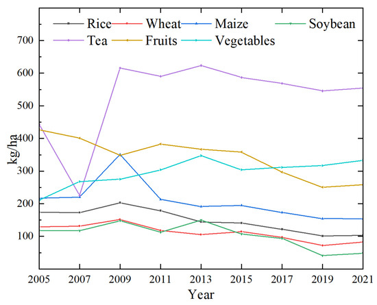 According to Chen et al. [37], nitrogen losses are correlated with the amount of N fertilizer applied. Excessive nitrogen fertilizer inputs exceeding crop requirements may induce N2O emissions. For direct N2O emissions from rice, wheat, and maize, we relied on the experimental results of Chen et al. For direct N2O emissions from soybeans, we referred to the research method of Gerber et al. [38]; for direct N2O emissions from vegetables, the present study was calculated based on the results of Mei et al. [39], and the calculation method of emissions from fruits and teas adopted the results of the study of Wang et al. [40]. The specific calculation formula is as follows: