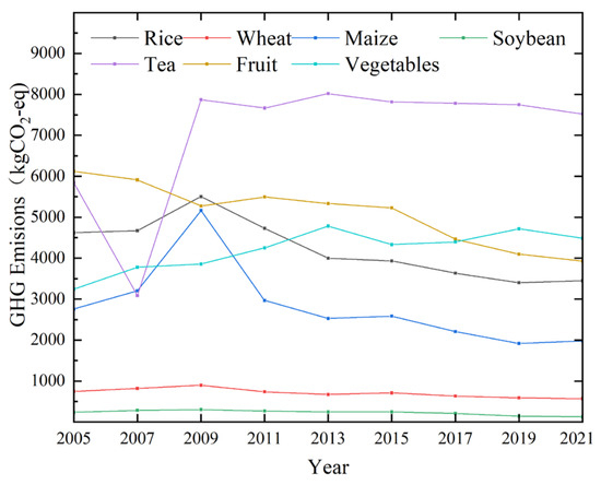As illustrated in Figure 6 and Figure 7, distinct variations in nitrogen surplus and greenhouse gas (GHG) emissions per unit area are observed between two categories of crops. Between 2005 and 2009, the grain crops (rice, wheat, maize, and soybean) exhibited an increasing trend in nitrogen surplus and GHG emissions per unit area, peaking in 2009, followed by a declining trend up to 2021. Concurrently, the cash crops (tea and fruits) showed an overall decreasing trend in these parameters, while vegetables demonstrated a continuous increase. Cash crops generally have a higher nitrogen surplus and GHG emissions per unit area than grain crops. Specifically, among the cash crops, vegetables have the lowest mean annual nitrogen surplus per unit area, at 296.72 kg/ha, which is still higher than grain crops, with maize having the highest at 207.65 kg/ha. The tea crop has the highest mean annual nitrogen surplus per unit area, reaching 528.28 kg/ha. In terms of GHG emissions, the mean annual emissions per unit area for crops, ranked from highest to lowest, are as follows: tea (7039.14 kg CO2 eq/ha), fruits (5094.67 kg CO2 eq/ha), rice (4215.49 kg CO2 eq/ha), vegetables (4205.56 kg CO2 eq/ha), maize (2811.89 kg CO2 eq/ha), wheat (708.24 kg CO2 eq/ha), and soybean (228.38 kg CO2 eq/ha). The annual mean GHG emissions of tea are 2823.65 kg CO2 eq/ha higher than those of rice, which has the highest emissions among grain crops.