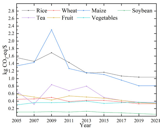 As depicted in Figure 9, the greenhouse gas (GHG) emissions, standardized by the economic value of the crops (expressed in kilograms of carbon dioxide equivalent per US dollar), exhibited a secular increase for grain crops from 2005 to 2009, reaching a peak in 2009, followed by a declining trend through 2021. Within the category of cash crops, vegetables demonstrated a fluctuating upward trend in standardized emissions, whereas fruits and tea showed a decreasing trend. This phenomenon indicates a year-on-year fluctuating increase in the GHG emissions associated with producing each dollar’s worth of vegetables. The standardized emissions for grain crops are generally higher than those for cash crops. Rice has the highest mean annual emissions at 1.29 kg CO2 eq/$, followed by maize (1.24 kg CO2 eq/$), tea (0.55 kg CO2 eq/$), fruits (0.46 kg CO2 eq/$), wheat (0.41 kg CO2 eq/$), vegetables (0.36 kg CO2 eq/$), and soybeans (0.10 kg CO2 eq/$). These data suggest that the GHG emissions per unit of economic value for grain crop production are comparatively higher than those for cash crops. This phenomenon is correlated with the pricing of crops. Cash crops are often considered luxury or specialty consumer goods, whereas grain crops (wheat, rice, maize, etc.) are essential commodities for basic living needs. Their prices are subject to governmental control or subsidies, resulting in relatively lower costs.