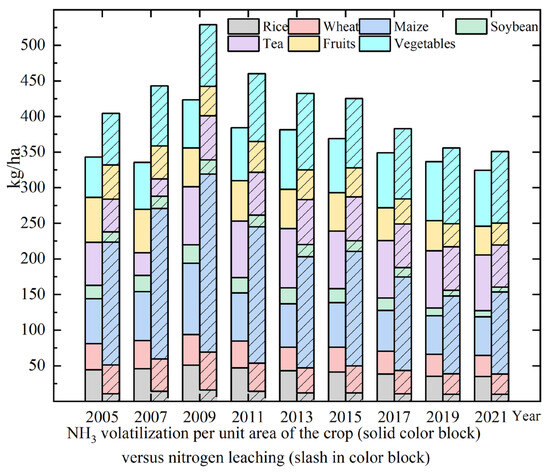 NH3 volatilization and nitrogen leaching are two critical pathways of nitrogen fertilizer loss after the agricultural production process, and analyzing the unit intensity of both provides a more intuitive measure of their pollution of the environment. The calculation of NH3 volatilization for rice, wheat, and maize was quoted from Chen et al. [37]; for NH3 volatilization of soybean, fruit, and tea, we used Zhang et al. [35]. For NH3 volatilization of vegetables, we used Ti et al. [41]. with the following formulae: