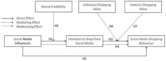 Social influence has become a prominent focus in contemporary consumer behavior research, particularly social commerce [14,23]. Multiple studies have explored the dynamics of social commerce, fostering new business models integrating social interactions with e-commerce and emphasizing consumer engagement and credibility [24,25]. This study draws upon Kelman’s social influence theory as a foundational framework [20,26], enriching our understanding of how SMIs, as independent variables, shape individuals’ intentions and behaviors related to social media shopping. Integrating social influence theory adds depth to our exploration, elucidating direct and indirect influences and highlighting the nuances within individuals’ responses to social influence [20]. Direct influence entails a clear, immediate impact, while indirect influence involves a more subtle, complex effect, often manifesting through shared group norms, beliefs, and expectations [26]. The theory posits that other members of society influence an individual’s behavior through processes such as conformity, compliance, and internalization [20]. Conformity aligns behavior with prevailing trends endorsed by external factors such as SMIs, even if it deviates from personal preferences, while compliance entails making purchases based on direct recommendations. Internalization involves a deep alignment of individual values and style with those of SMIs [20]. Social influence theory can provide a theoretical framework for understanding how SMIs, intentions, behaviors, brand credibility, and shopping values influence consumer decision-making processes in social commerce. These variables influence each other through social comparison, conformity, and informational influence, ultimately impacting consumer attitudes, intentions, and behaviors in the digital marketplace.