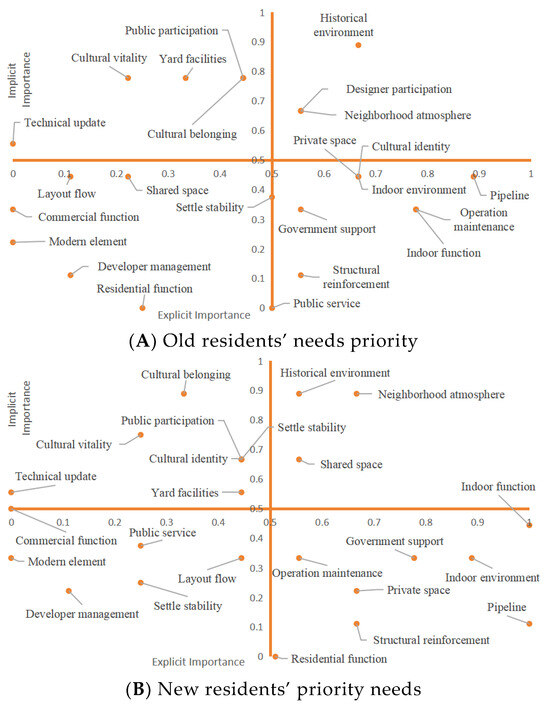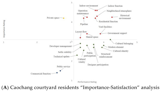 Based on the KANO model, further exploration of the relationship between the importance and satisfaction of various needs was conducted. Using the Importance–Satisfaction model can compared the key concerns and satisfaction-related issues with the renovation outcomes among users of the three types of courtyards. The findings indicate the primary focus areas for future improvements. The analysis results for the three courtyards are shown in Figure 12.