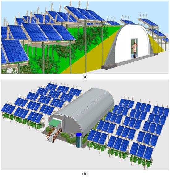 Agrivoltaic agrotunnel: (a) subterranean agrivoltaic agrotunnel; (b) semi-mobile agrivoltaic agrotunnel.