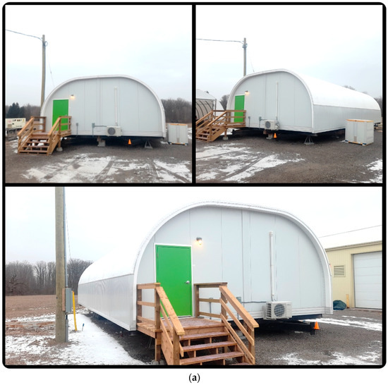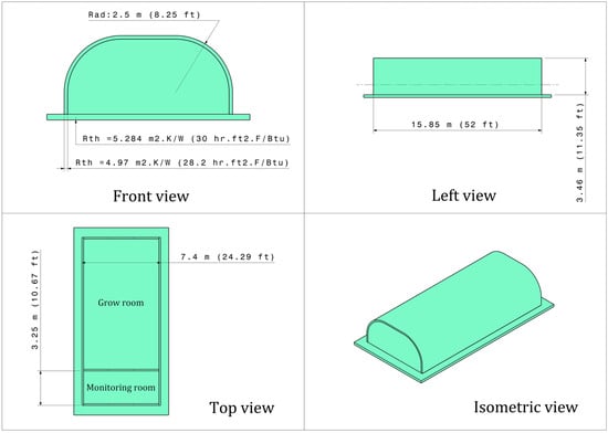 The agrotunnel (Food Security Structures Canada (FSSC) [56], London, ON, Canada) presents a solution to combat food insecurity by offering an easily assembled, scalable, and sustainable indoor vertical farming structure. It is designed to withstand extreme climate conditions and can be adapted to various locations. FSSC uses fiber reinforced polymer (FRP) construction to enhance its portability, strength, and its lightweight design to reduce the embodied energy and emissions for transportation. This innovative growing chamber enables precise control of light, humidity, and temperature, facilitating year-round cultivation of hybrid-aeroponic fruits and vegetables in harsh environments. Assembling the 1.2 m × 2.4 m panels allows for easy transportation of components. The detailed dimensions and thermal resistances of the agrotunnel envelope are illustrated in Figure 2.