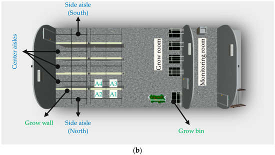 The agrotunnel under study is located at the Western Innovation for Renewable Energy Deployment (WIRED) in London, ON, Canada (Figure 3a). As shown in Figure 3b, the design is composed of two sections (grow room and monitoring room). Eight grow walls, each with two sides and two mini walls for each side, are installed in the growing room in addition to six grow bins. Utilizing the same growing technology as the grow walls featuring adjustable lighting brackets, the grow bins offer an ideal growing setting for root vegetables and other plants that demand greater space.