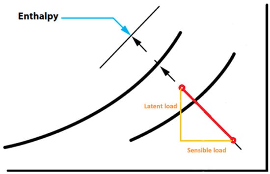 During this process, the moisture of the soil and the plants’ leaves absorbs heat from the environment, causing a temperature drop (sensible heating load) and then evaporating. The energy absorbed is converted to latent heat of vapor in the air, which causes an increase in the humidity level of the microclimate (the latent cooling load). This transfer in energy leads to a constant enthalpy process, which is shown in Figure 6.