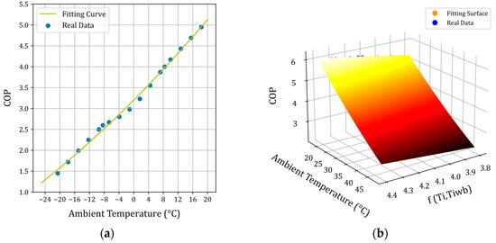 Fitting curves of COP for 18,000 Btu/h heat pump: (a) heating mode; (b) cooling mode.