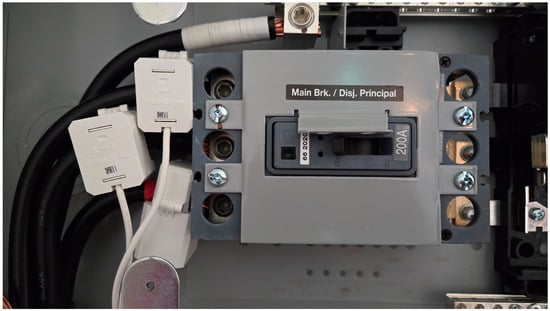 The power consumption data for the agrotunnel were measured using the Emporia Energy Vue 8 Smart 3-Phase Gen 2 Home Energy Monitor manufactured by Emporia Renewable Energy Corporation, CO, USA [68], although an open source meter could be used [69,70]. The Energy Vue meter is capable of measuring current up to 200 A from the mains. The electrical breaker panel is a 200-A, 3-phase panel. The three main clamps are connected to the three hot wires coming from the grid to the panel (Figure 9).
