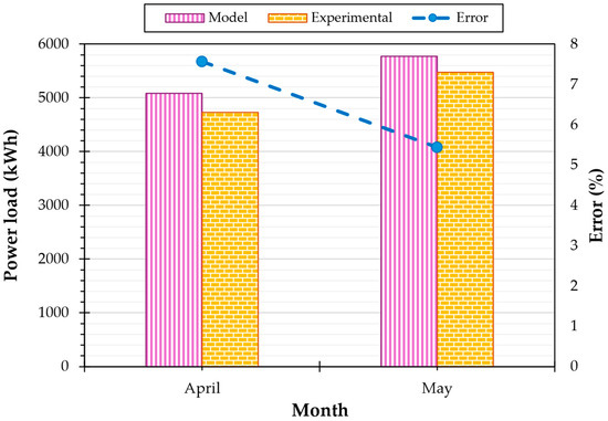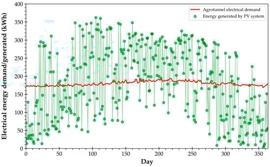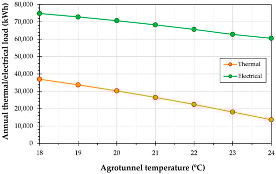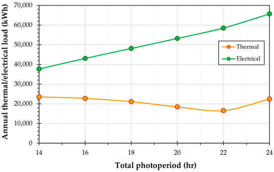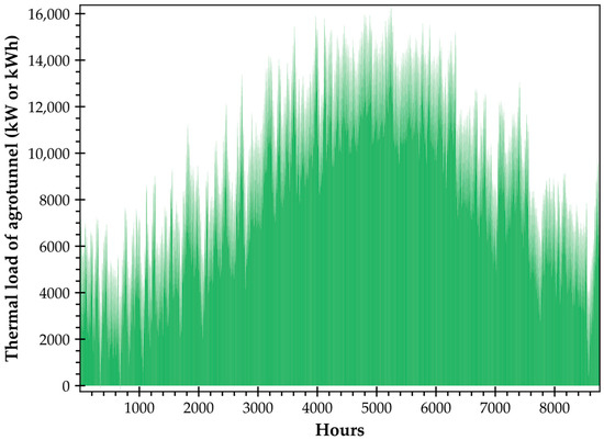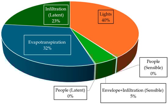 The agrotunnel’s load is made up of four sub systems: lights, water pumps, heat pump (HP), and a dehumidifier. A dehumidifier is operated to assist HPs in maintaining the relative humidity (RH) at a desired level. The HP is the major component in meeting the thermal (sensitive and latent) loads of the system. Artificial lighting also has a major contribution to increasing the temperature of the agrotunnel’s microclimate. All these loads are characterized as shown in Figure 5. Sizing all the thermal and electrical equipment would be done based on the loads as the results of the structure’s specifications and the circumstances the plants will grow under.
