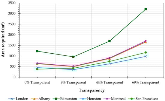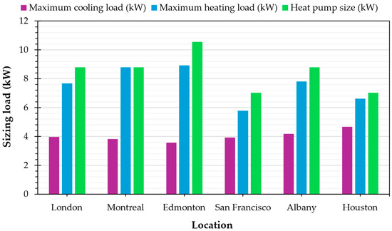 PV system sizing was carried out by determining the 1-kW PV potential using the open-source System Advisor Model (SAM) [74] for each of the six locations: Albany, Edmonton, Houston, London, Montreal, and San Francisco. Using the total annual electrical energy required for agrotunnel operation (, in kWh) in each location and the annual energy potential of 1-kW PV system determined from SAM (, in (kWh)), the total PV system size () required to meet the annual electrical load is ascertained. The formula for determining the PV size in (kW) is given by Equation (17):