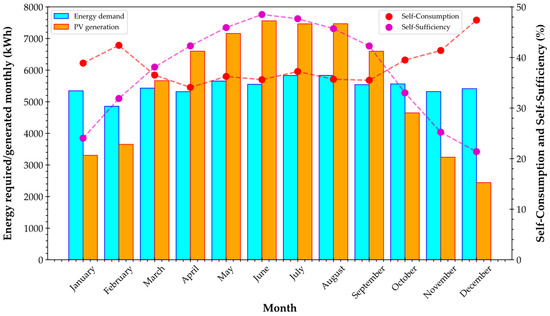Self-consumption (SC) and self-sufficiency (SS) are important metrics for assessing the energy performance of distributed energy systems at the local level [75]. SC measures the proportion of locally produced energy that is consumed locally, calculated as the energy generated by the PV system () minus the energy sent to the grid (), divided by the total energy generated by the PV system () as seen in Equation (18). SS, on the other hand, indicates the extent to which local energy production meets local energy demand, calculated as the energy generated by the PV system minus the energy sent to the grid, divided by the local energy consumption () (Equation (19)). Both metrics exclude nighttime hours when the PV system is not operational, and all energy is sourced from the grid, thus SC and SS are set to zero during these times. These metrics can be formulated through Equations (18) and (19) [76,77].