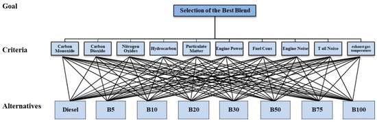 The proposed methodology for selecting the best blend is outlined in Figure 2. Firstly, the alternative blends and their evaluation criteria are identified, and a decision hierarchy is established. Secondly, a single-cylinder four-stroke naturally aspirated compression-ignition engine is operated at a constant speed for different alternatives with variable loads to observe the performance, combustion, and emission characteristics. Lastly, the other options are ranked using the GRA-TOPSIS methodology based on observed readings and the relative weights of the evaluation criteria.