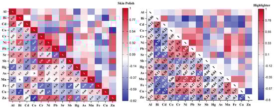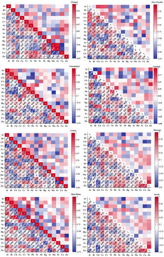Pearson correlation between metal(loid)s in different cosmetic products, figuring out the connections between various metal(loid)s in cosmetic samples.