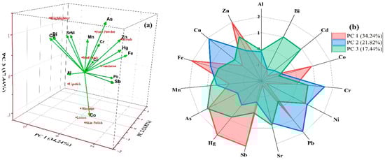 Principal component analysis (a) and PC loading values (b) of metal(loid)s in different cosmetic products.