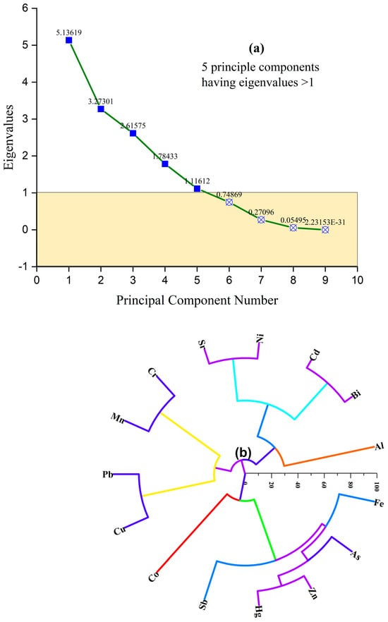 According to PCA, three principal components with eigenvalues of 1 or greater accounted for about 92.84% of the total variance in the measured parameters. The first component, with an eigenvalue of 5.14, explained approximately 34.24% of the variance. The second component, with an eigenvalue of 3.27, accounted for 21.82%, while the fourth component, with an eigenvalue of 1.78, contributed 11.90%. Lastly, the component with an eigenvalue of 1.11 explained 7.44% of the variance (refer to Table S5 in the Supplementary Materials). Consequently, the scree plot indicated that the potentially toxic metal(loid)s were derived from five distinct sources, as illustrated in Figure 3a. To further validate the PCA results, HCA was employed to group the metals into correlated classes within a variable space. Figure 3b demonstrates the alignment between the PCA findings and the HCA dendrogram, which identified five separate clusters. One group was formed by Bi, Cd, Ni, and Sr concentrations, second cluster comprising Cr, Mn, Pb, and Cu concentrations, and a third cluster included Sb, Hg, Zn, As, and Fe. Co and Al clustered separately, which indicates their independent sources of contamination in cosmetic products. In addition, Sb represented less associations with other metals in the third cluster, as shown in the circular cluster graph (Figure 3b).