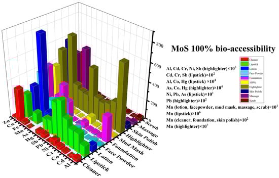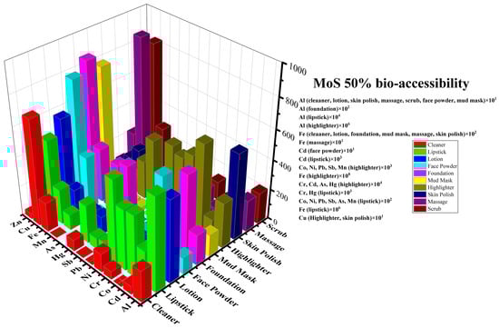 The methodology developed by the SCCS for testing and evaluating the safety of cosmetic elements served as the foundation for the development of the MoS [49]. The MoS (Figure 4) evaluation in this current study was based on the dermal bioavailability of the cosmetic product at 50% and 100% of the identified metal(loid) content. At 50% bio-accessibility, the MoS of Al and Fe was greater than 100, which indicates safe levels in all cosmetics. But, at 100% bio-accessibility, Al values were <100 in cleaner, lotion, face powder, mud mask, skin polish, massage cream, and scrub. Moreover, Fe levels at 100% bio-accessibility were below 100, showing unsafe and obvious risk levels. The MoS results of Co, Cr, Ni, Pb, Sb, Hg, and Mn in both 50% and 100% scenarios were less than 100 in all cosmetics except for lipstick and highlighter, representing their potential risk, especially referring to condemnation from different sources. Cd results at 50% and 100% bio-accessibility were in safe ranges only for lotion, highlighter, lipstick and foundation; its MoS results were >100 (Figure 4), indicating safe margin of exposure. Fe levels were safe from exposure in all cosmetic products at 50% bio-accessibility. But, in cases of 100% bio-accessibility, its values were less than 100, indicating risk through dermal exposure. Cu values were within safe limits (MoS > 100) at 50% and 100% bio-accessibility. In lipstick, lotion, and massage cream, the MoS ranges for Zn were greater than 100 at a bio-accessibility of 50%. On the other hand, at 100% bio-accessibility, its results were less than 100 for all cosmetics products except for lotion and massage cream. The findings of this current study are consistent with previous research. According to the results of a recent investigation, every metal(loid) in the powdered cosmetics for face had a MOS value of less than 100, with the exception of Pb and Cr, which came from a local Ghanaian market [25]. Furthermore, samples gathered from various markets in Pakistan showed MoS values exceeding 100 for hair dye, foundation, whitening cream, and lipstick. Conversely, MoS values for Cd, Cr, and Pb in lotions and sunscreens were below 100 [2].