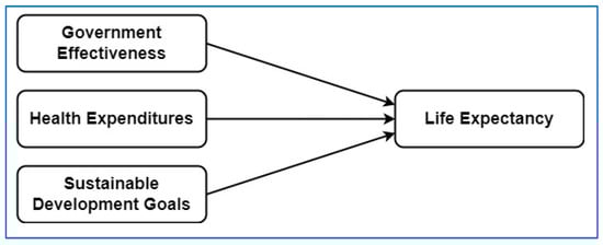 Life expectancy is influenced by a number of important factors, including government effectiveness, health care spending, and the achievement of SDGs. There is limited research that explicitly examined the causal pathways through which government effectiveness, healthcare expenditures, and SDGs achievements translate into improved life expectancy. To investigate these mechanisms, more thorough research is required. Even with a great deal of research, there are still unanswered questions. By analyzing time series data, researchers can uncover valuable insights into the interplay between policy, investment, and health outcomes. This investigation thus aims to shed light on how these factors shape the well-being and life expectancy for the population of Pakistan. Specifically, this study seeks to determine the relationship between health expenditures and life expectancy, the impact of SDGs on life expectancy, and the relationship between government effectiveness and life expectancy (Figure 1). With the help of these objectives, this study intends to offer a comprehensive understanding of the factors influencing change in life expectancy in the Pakistani population. Unravelling these dynamics is essential for informed decision-making and targeted interventions to enhance public healthcare and promote sustainable development.