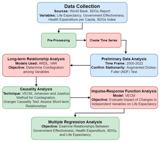 During the third phase, the inquiry was broadened to examine the presence and direction of causation by employing the vector error correction model (VECM). The Johansen and Juselius technique were used to establish cointegration among the variables. The Granger causality test was used to analyze short-term causal relationships among the variables. This test assesses the direction and presence of causality. The study used impulse response function analysis to examine the influence of government efficacy, healthcare expenditure, and the SDGs index on life expectancy. Utilizing the VECM provided a detailed comprehension of how the model reacts to certain shocks over time. The analysis was performed using EViews version 11. Multiple regression analysis was utilized to examine the relationship between government effectiveness, health care expenditure, and SDGs with life expectancy (Figure 2). Equation (1) models this study.