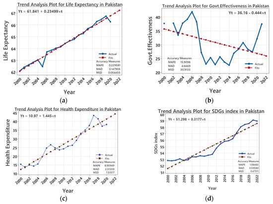 Trend behavior of the factors: (a) life expectancy; (b) government effectiveness; (c) SDGs; (d) health expenditure.