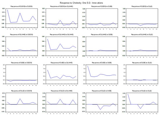 The impulse response function gives a glance view of contemporaneous short-run innovations or shocks on the dependent variable. Keeping the dependent variable last for VECM, the following recursive structure explains the first contemporaneous effect on the later variable without considering the reverse effect. Impulse response functions are shown in Figure 4.