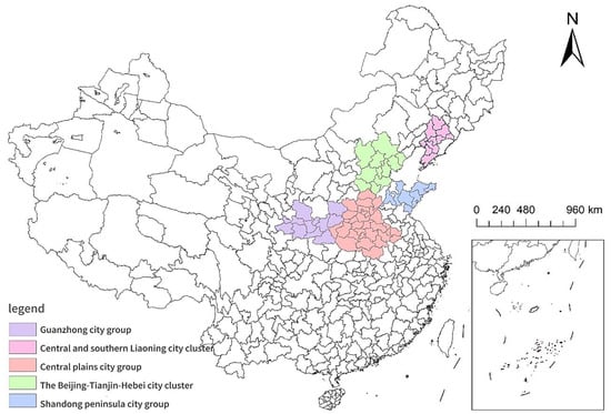 At present, the world is experiencing the third energy transition for sustainable development []. In the context of global energy transition and rapid urbanization, northern urban agglomerations are dominated by heavy industry with large energy consumption. Moreover, their production structure is relatively undiversified, and they mainly rely on traditional energy resources (such as coal), thus playing an important role in political and economic development. Urban agglomerations in northern China generally face severe environmental challenges, including air pollution, water use and land use. Therefore, the study of northern urban agglomerations can provide a key reference for the national carbon emission reduction. Most of the cities in northern urban agglomerations are resource-exhausted cities, which are faced with prominent environmental problems and serious pollution problems. By studying the northern urban agglomeration, we can promote the construction of ecological civilization and promote the formulation of scientific carbon emission reduction policies.