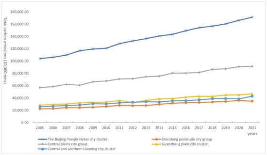 Total carbon emissions of five major northern urban agglomerations from 2005 to 2021.