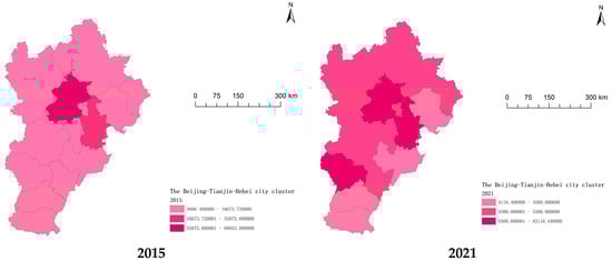 Carbon emissions of the Beijing–Tianjin–Hebei City Cluster in 2005, 2010, 2015, and 2021.