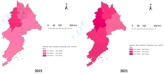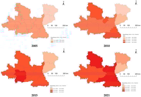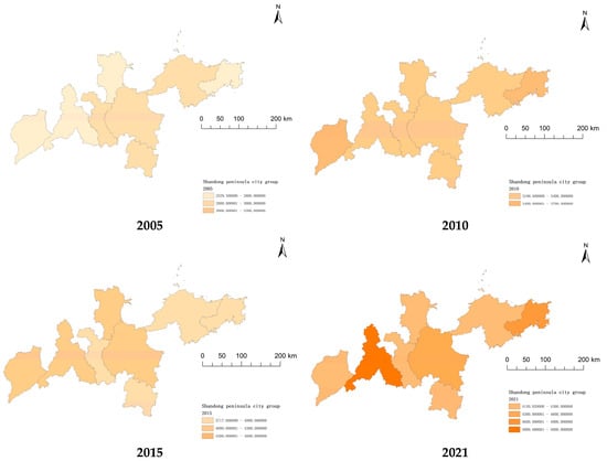 By comparing the total carbon emissions of the five urban agglomerations from 2005 to 2021, it is found that the total carbon emissions of the five urban agglomerations from 2005 to 2021 are large and show an upward trend. As can be seen from the figure, in recent years, the total carbon emission of the Beijing–Tianjin–Hebei urban agglomeration has far exceeded that of the other four northern urban agglomerations, always ranking first and remaining high, or will show an upward trend. The carbon emission trends of the Shandong Peninsula city cluster, Guanzhong plain city cluster, central and southern Liaoning city cluster, and Central Plains city cluster are very similar. The carbon emission of Shandong Peninsula urban agglomeration is always relatively low, and the growth is slow and stable. The Central Plains city group is located between the Beijing–Tianjin–Hebei City group and the Guanzhong City group, with a steady upward trend as a whole. In recent years, the carbon emissions of Shandong Peninsula city cluster, south central Liaoning city cluster and Guanzhong Plain city cluster are close to each other in terms of total amount and growth trend. In summary, the total amount of carbon emissions may continue to increase in the future, and it is urgent to find a positive solution to the problem of carbon emissions.