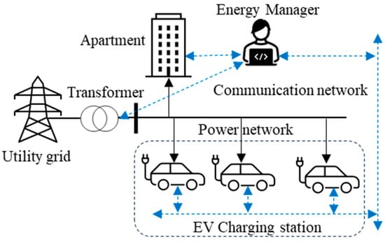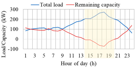An overview of the proposed demand management process is shown in Figure 4. First, the hourly load of the apartment (building) and the EVs in the parking station (estimated in the previous section) is obtained. Then, the remaining capacity of the transformer for interval t () is determined as