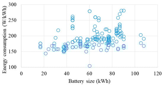 After estimating the daily mileage for vehicles, the study incorporates technical parameters specific to EVs. The dataset, referenced in [35], provides information on the mileage efficiency and usable battery size of all commercially available EVs. As of March 2024, the average energy efficiency for EVs is 195 Wh/km, and the average usable battery size is 68.9 kWh. An overview of different EV models is presented in Figure 2. These data serve as the foundation for computing the daily energy consumption of EVs. Figure 3 illustrates the daily energy consumption of EVs, showing that most EVs consume under 25 kWh of energy per day. This observation aligns well with the average vehicle mileage of under 100 km per day and an average energy efficiency of 195 Wh/km.