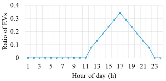 Based on the load profiles of individual EVs, the load of the EV fleet can be determined. The net load of the EV fleet is necessary for each interval to maintain the normal operation of the transformer and prevent overloading. The daily EV load relies on various factors, such as the daily mileage of EVs, the energy efficiency of the vehicles, and the state-of-charge (SOC) upon the EVs’ return [32]. These parameters are inherently stochastic and are dependent on the behavior of the EV driver. As a result, most of these parameters, including daily mileage and SOC, are typically estimated using lognormal distributions [33,34]. Mathematically, daily mileage can be written as