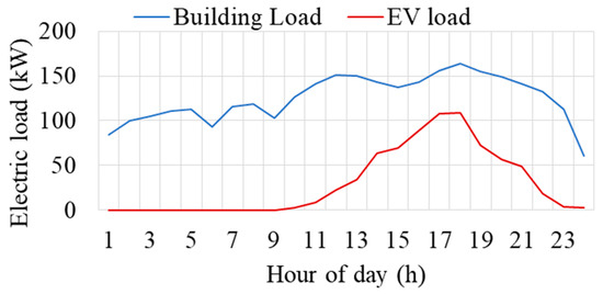 In this study, a residential apartment with a shared parking station is used, as shown in Figure 1. An EV fleet of 50 EVs is considered [35], and the distribution of EVs at the charging station during different hours of the day is depicted in Figure 5. Level 1 and level 2 chargers are considered, which are most commonly used in the residential sector. Notably, as a residential community, the majority of EVs arrive during evening hours, as expected. Figure 6 shows the hourly load profile of the building (apartment) sourced from the US distribution network, coupled with the EV load estimated as discussed in Section 2.2. This figure highlights the simultaneous occurrence of the EV peak load with the residential peak load, as previously mentioned in the introduction [5]. Finally, Figure 7 presents the total load, comprising both the combined EV and building load, shown with the remaining capacity of the transformer. The remaining capacity denotes the transformer capacity available after catering to the building and EV load. Notably, during intervals 14–20, the transformer’s remaining capacity becomes negative, indicating overload situations. This signifies the necessity for load adjustments to avert transformer overloading during these intervals.