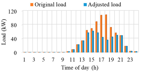 This section analyzes the load adjustment achieved through the proposed method by comparing it with the original EV load. Figure 8 provides an overview of the results, while a more in-depth analysis is presented in the subsequent section. The original EV load directly corresponds to the count of EVs at the charging station during different hours of the day (highlighted in figure). Notably, the proposed method reduces the load solely during the 14–20 h intervals, a response to identified transformer overloading occurrences within these time frames, as evidenced in Figure 7. The adjusted load correlates directly with the extent of transformer overload. For instance, the most substantial load reduction is evident in intervals 17 and 18, coinciding with severe transformer overloading. Conversely, minor load adjustments are visible in intervals 14 and 20 due to marginal overloading. No load adjustment during 10–13 h and 21–24 h, as the load remains lower compared to the transformer capacity.